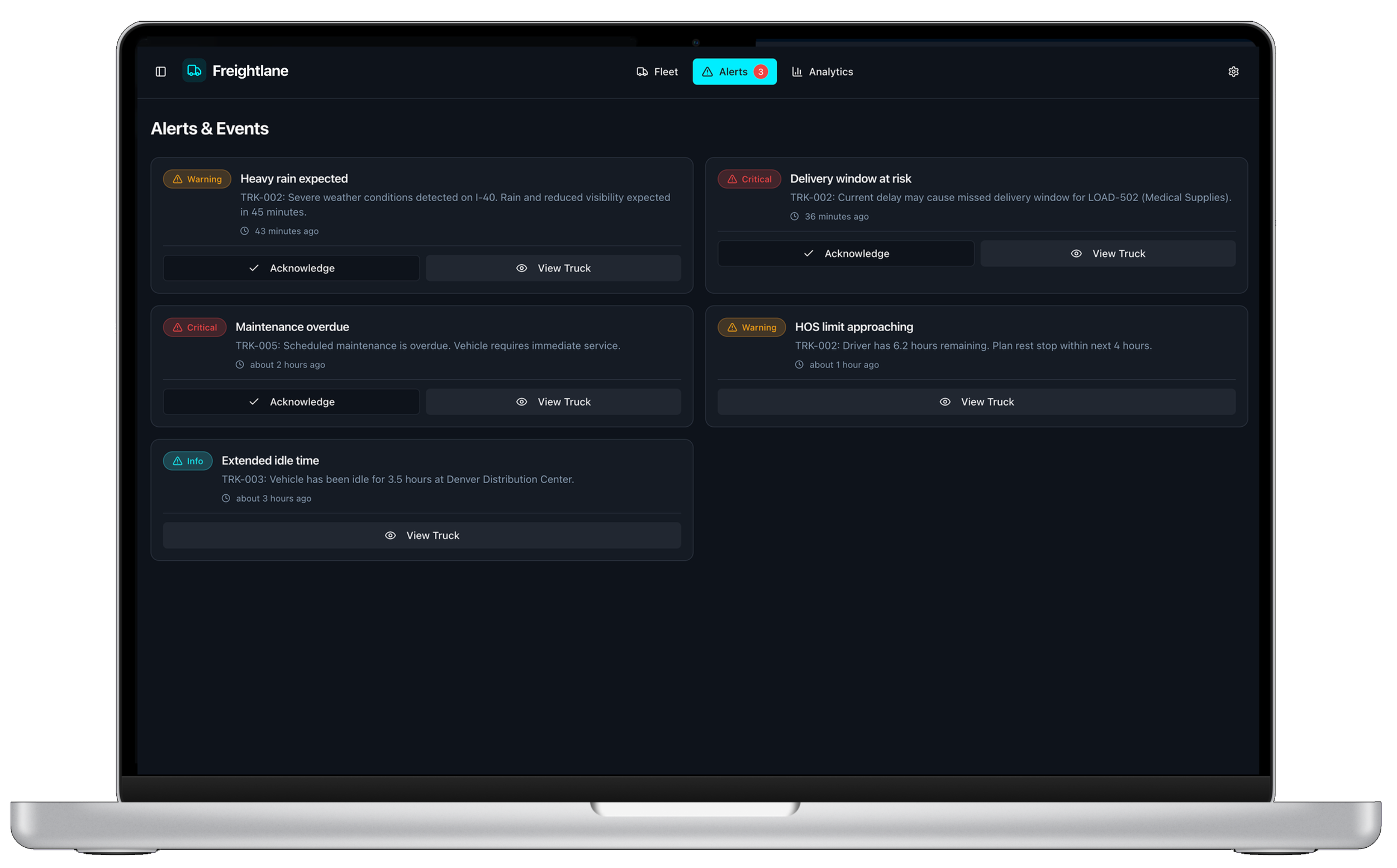 | Action | Reroutes a truck, sends a message to the driver, or acknowledges/snoozes the alert from the same screen. | “Let me fix this before it becomes a bigger problem.” | One-click resolution flows, quick-reply templates, and confirmations that the alert is now handled. |