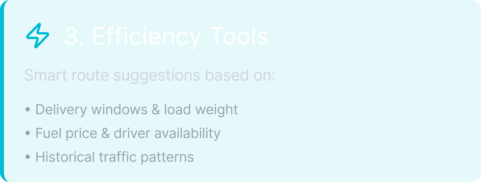 | Action | Messages the driver or initiates rerouting. | “How do I fix this quickly?” | One-click suggested actions and immediate confirmation feedback. |