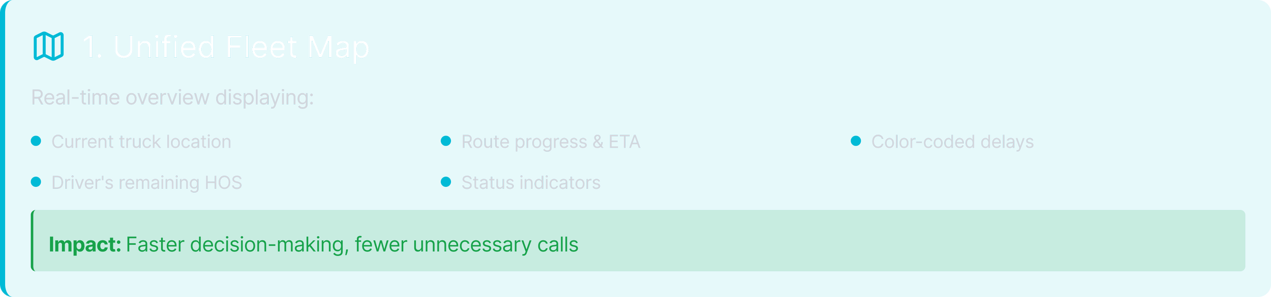 Outdated (sometimes misleading) dashboard features, spreadsheets for load details, separate systems for maintenance alerts, and manual phone updates from drivers.