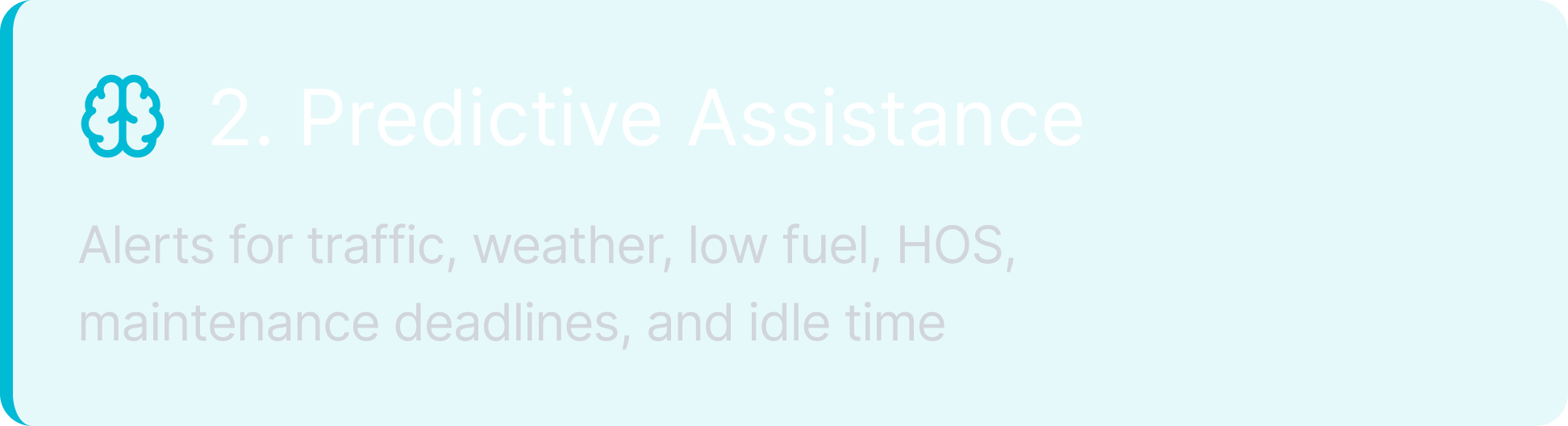 | Exploration | Reviews alert details such as weather, traffic, HOS risk, or maintenance issues and sees impact on ETA or delivery window. | “How serious is this and what happens if I do nothing?” | Plain-language risk descriptions, link to truck or route, and simple visualization of impact. |